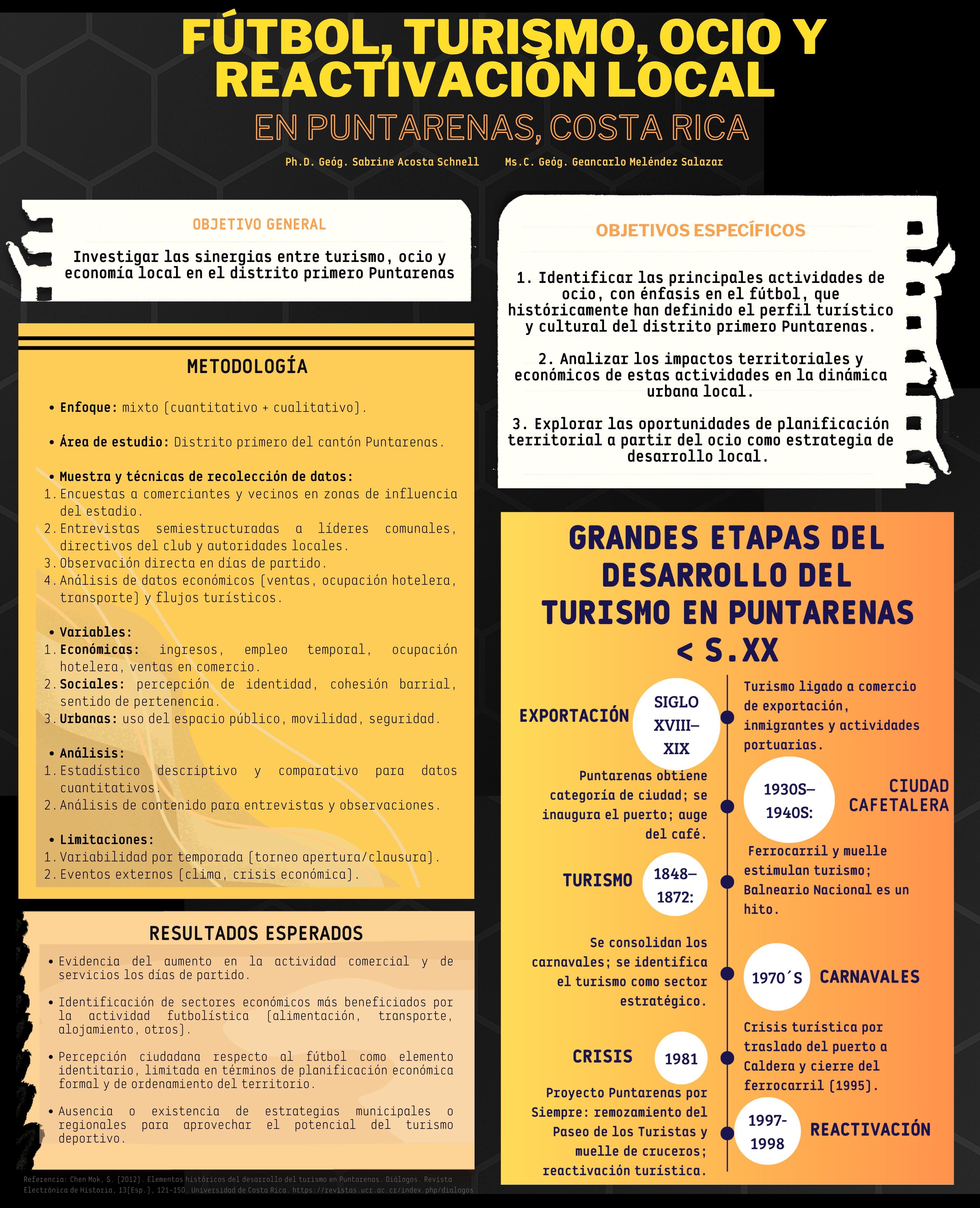 El póster es una propuesta de investigación para TFG de Licenciatura en Geografía. Tiene como objetivo examinar las sinergias entre el turismo, las actividades de ocio y la economía local en el distrito primero del cantón de Puntarenas. El estudio parte del reconocimiento del fútbol como fenómeno sociocultural con capacidad de dinamizar la economía urbana y promover procesos de revitalización territorial. Desde un enfoque mixto —cuantitativo y cualitativo— se propone emplear encuestas a comerciantes, entrevistas semiestructuradas con líderes locales y observaciones directas en días de partido, junto con el análisis de datos económicos y turísticos.