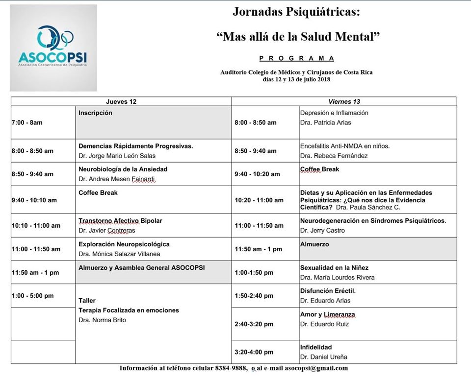 Programa de las Jornadas de Psiquiatría “Más allá de la Salud Mental”. Declaratoria de interés institucional CCSS. Evento realizado durante el 12 y 13 de Julio, Costa Rica, 2018.