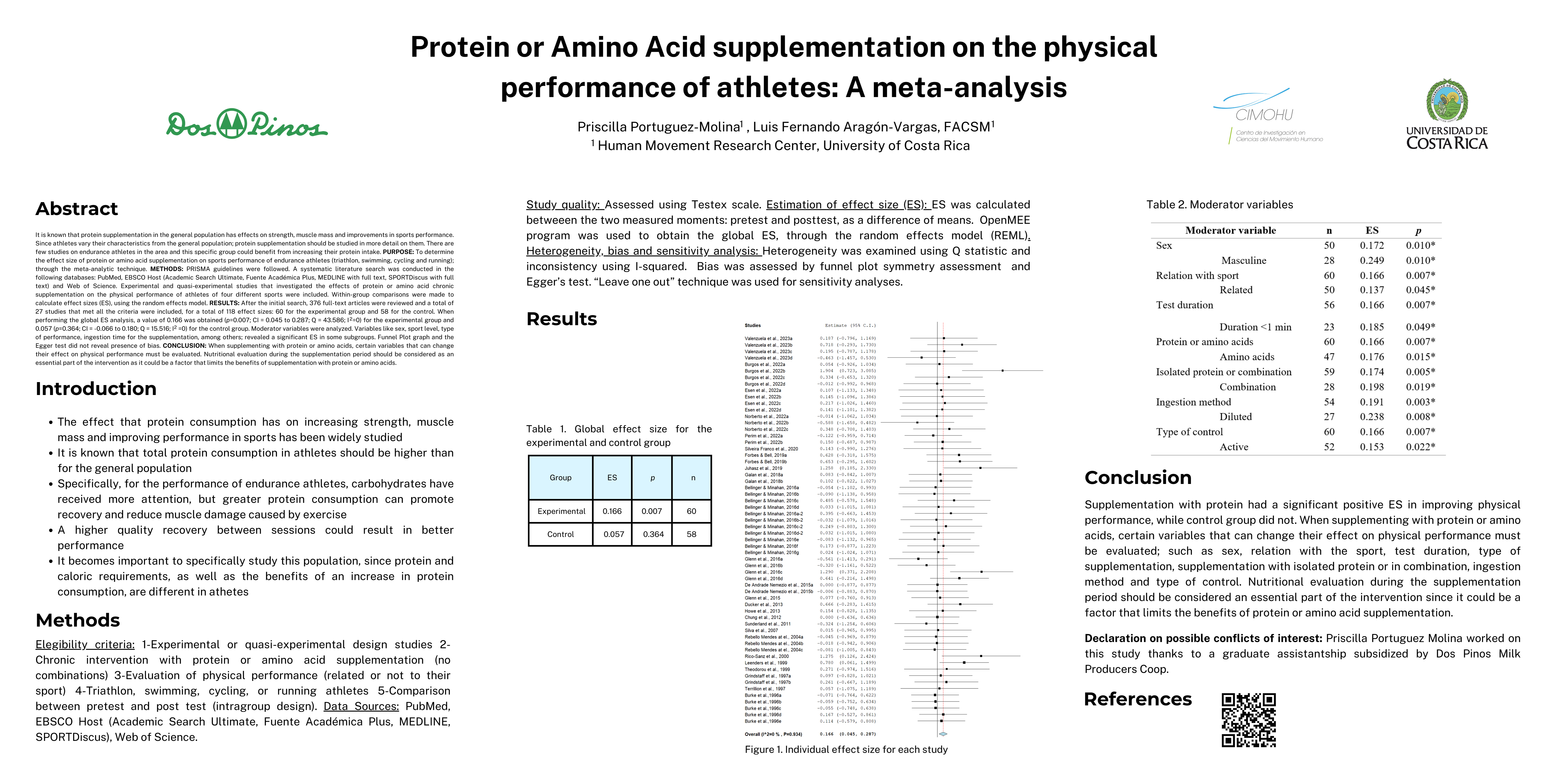 It is known that protein supplementation in the general population has effects on strength, muscle mass and improvements in sports performance. Since athletes vary their characteristics from the general population; protein supplementation should be studied in more detail on them. There are few studies on endurance athletes in the area and this specific group could benefit from increasing their protein intake. PURPOSE: To determine the effect size of protein or amino acid supplementation on sports performance of endurance athletes (triathlon, swimming, cycling and running); through the meta-analytic technique. METHODS: PRISMA guidelines were followed. A systematic literature search was conducted in the following databases: PubMEd, EBSCO Host (Academic Search Ultimate, Fuente Académica Plus, MEDLINE with full text, SPORTDiscus with full text) and Web of Science. Experimental and quasi-experimental studies that investigated the effects of protein or amino acids chronic supplementation on the physical performance of athletes of four different sports were included. Within-group comparisons were made to calculate effect sizes (ES), using the random effect model. RESULTS: After the initial search, 376 full-text articles were reviewed and a total of 27 studies that met all the criteria were included, for a total of 118 effect sizes: 60 for the experimental group and 58 for the control. When performing the global ES analysis, a value of 0.166 was obtained (p=0.007; CI = 0.045 to 0.287; Q = 43.586; I2 =0) for the experimental group and 0.057 (p=0.364; CI = -0.066 to 0.180; Q = 15.516; I2 =0) for the control group. Moderator variables were analyzed. Variables like sex, sport level, type of performance, ingestion time for the supplementation, among others; revealed a significant ES in some subgroups. Funnel Plot graph and the Egger test did not reveal presence of bias. CONCLUSION: When supplementing with protein or amino acids, certain variables that can change their effect on physical performance must be evaluated. Nutritional evaluation during the supplementation period should be considered as an essential part of the intervention as it could be a factor that limits the benefits of supplementation with protein or amino acids.