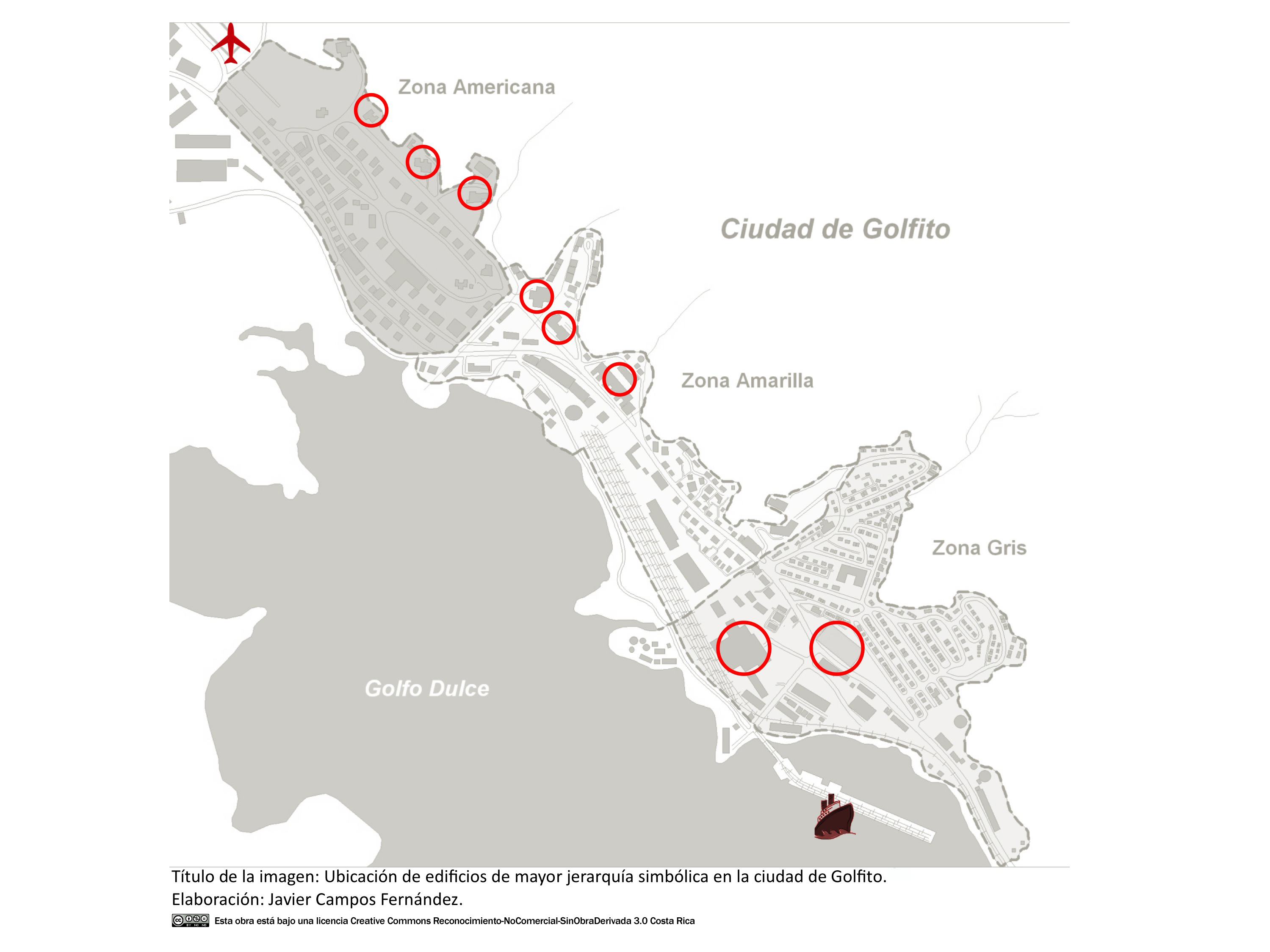 Ubicación de edificios de mayor jerarquía simbólica en la ciudad de Golfito.