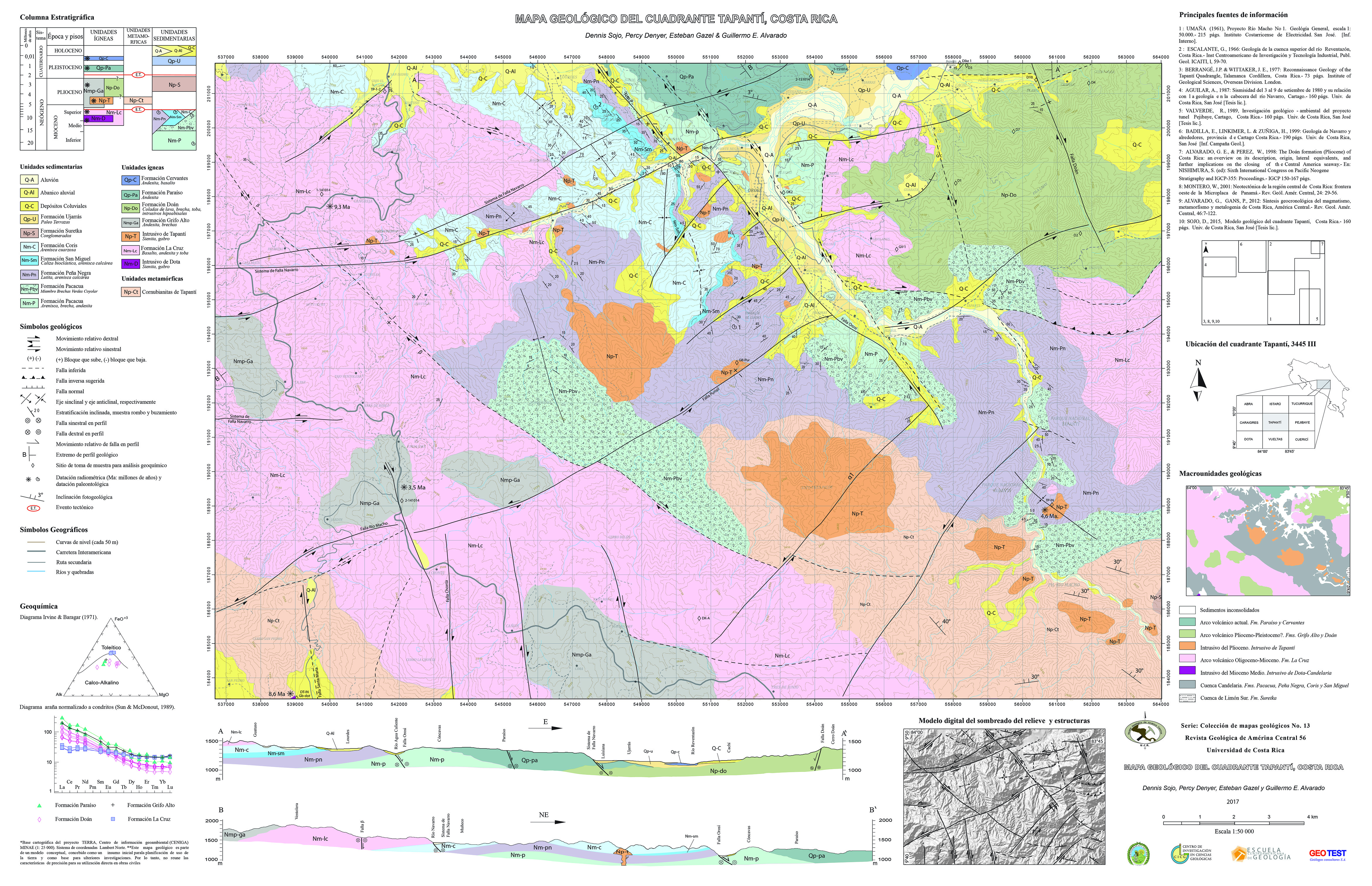 Se presenta un mapa geológico, escala 1:50 000 del cuadrante Tapantí, el cual se encuentra en la región cen-tral de Costa Rica y forma parte del Cinturón Deformado del Centro de Costa Rica (CDCCR), producto de la interacción de la cordillera de Coco y la región W de la microplaca Panamá. Las rocas más antiguas cartografiadas son miocenas y están representadas por las formaciones sedimentarias Pacacua, Peña Negra, San Miguel y Coris, que forman el borde oriental de la cuenca Candelaria. Se distinguieron 3 eventos magmáticos; el arco volcánico Mioceno, representando por la Formación La Cruz y clastos volcánicos de la Formación Pacacua; un nuevo periodo de actividad ígnea entre 6 Ma y 4,2 Ma, representado por las formaciones Grifo Alto, Doán y el Intrusivo de Tapantí y, finalmente, se desarrolla el arco volcánico actual, representado por las formaciones Paraíso y Cervantes, con un rango de edad entre los 0,6 Ma y 0,02 Ma. Desde el punto de vista geoquímico, se observa un fuerte cambio entre los 10 y 6 Ma, lo cual se expresa por medio del enriquecimiento de K y Si, y los cambios en la concentración de U, Sr, Ba, La. Dicho cambio corresponde temporalmente con el arribo de la cordillera de Coco a la Fosa Mesoamericana y es reflejado en la región por medio del arco magmático del Plioceno y el arco volcánico actual. El modelo estructural sugiere la existencia de 2 episodios de deformación, el pri-mero ocurrió durante el periodo comprendido entre el Mioceno Superior y el Plioceno y produjo la Zona de Plegamiento Orosi-Patarrá mientras que el segundo corresponde con la instauración del CDCCR, desde el Plioceno hasta la actualidad, conformado por fallas sinestrales con orientación ENE y dextrales con orientación NW.